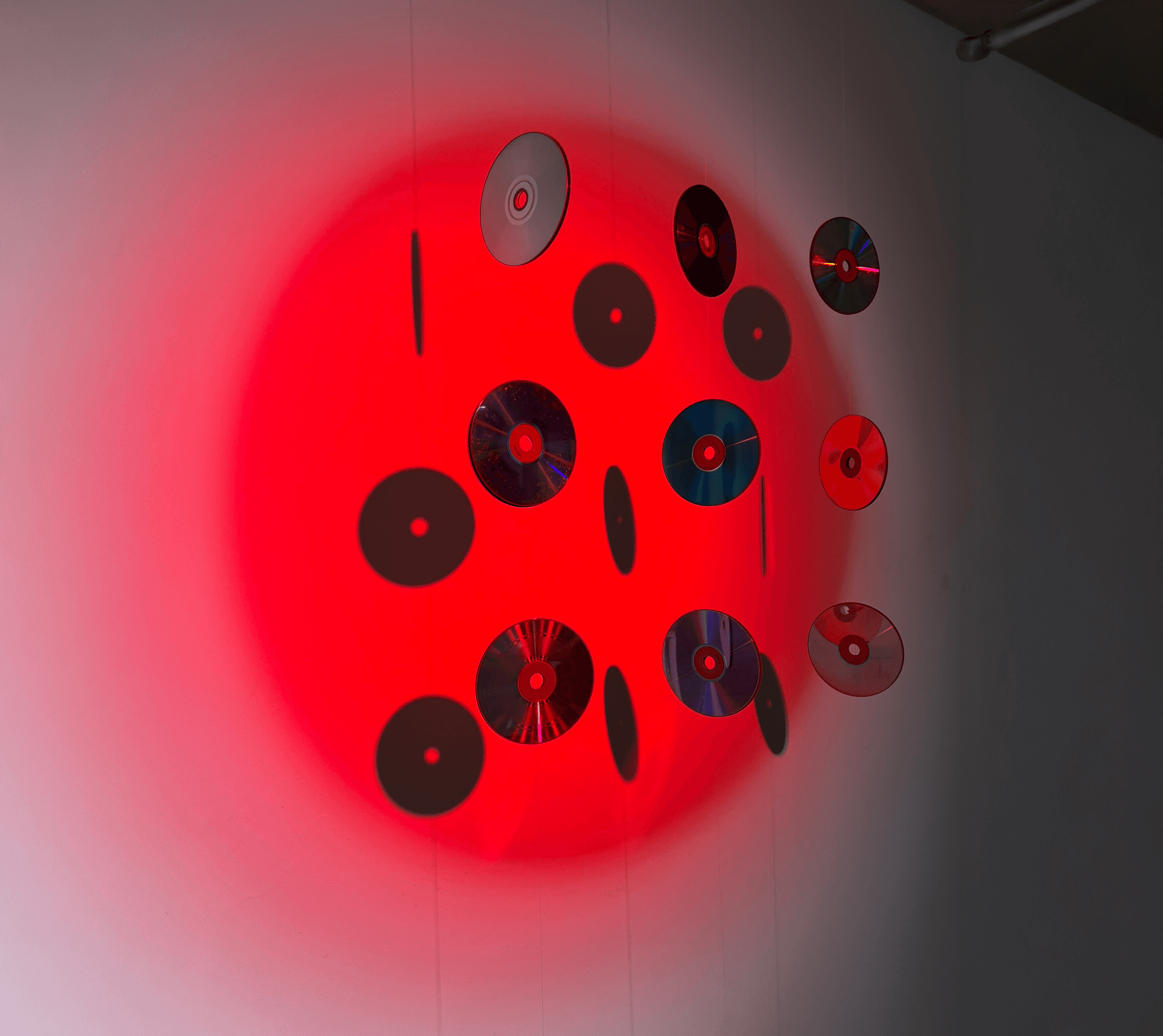 Voor de EICAS in Deventer maakte ik samen met zes mede-studenten De Bewegende Nullen een lichtinstallatie geïnspireerd op de Nul-beweging, waarin eenvoud, herhaling en ritme centraal staan. De installatie bestaat uit hangende cd-schijven die, beschenen door rood licht, voortdurend reflecties en schaduwen werpen. Door de kleinste luchtstroom of beweging verandert het beeld continu: een spel van licht, stilte en variatie binnen een ogenschijnlijk statische compositie. Het werk verbeeldt de essentie van de Nul-beweging de zoektocht naar balans tussen orde en toeval, tussen leegte en beleving en nodigt de bezoeker uit om stil te staan bij het moment waarop beweging en rust samenvallen.